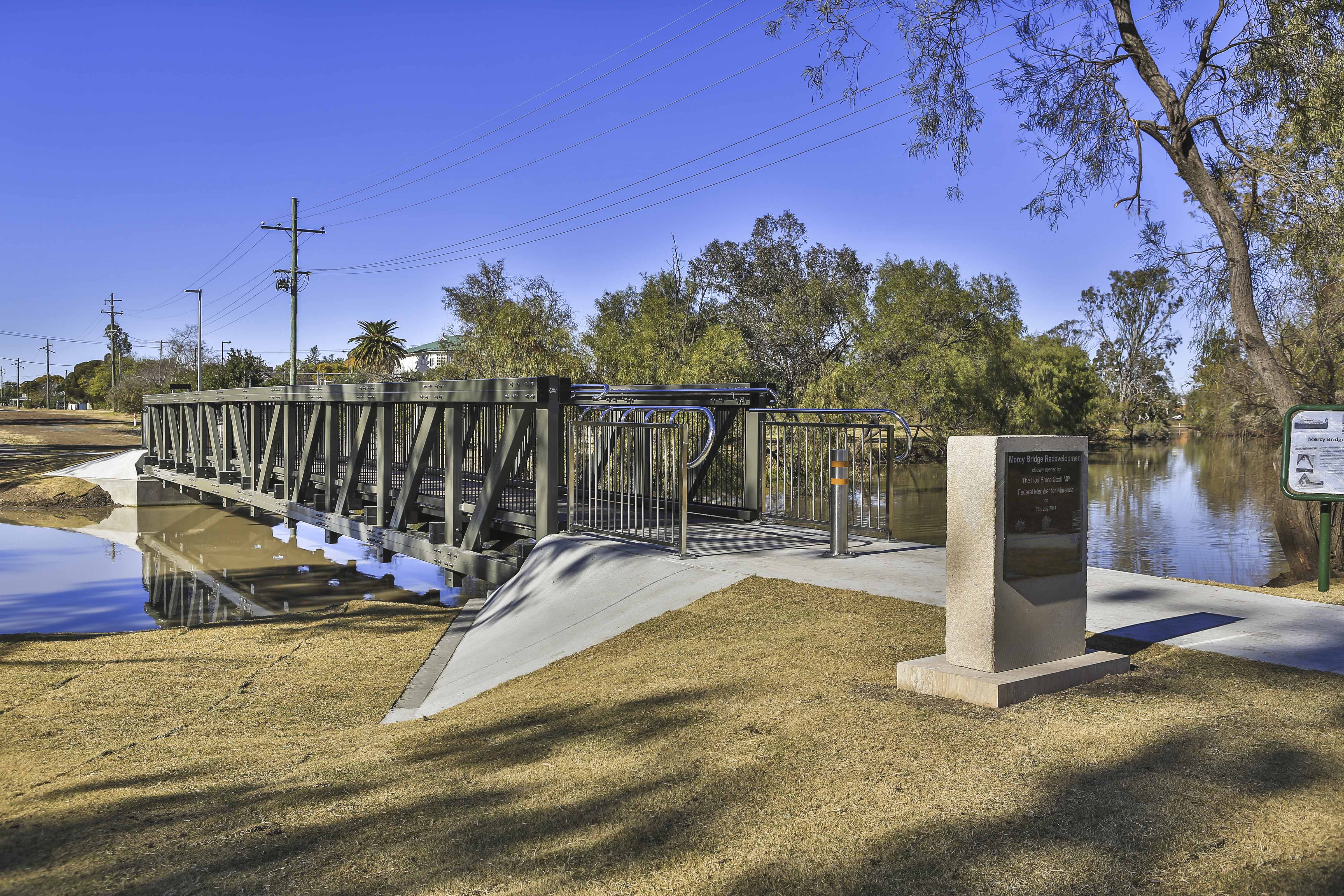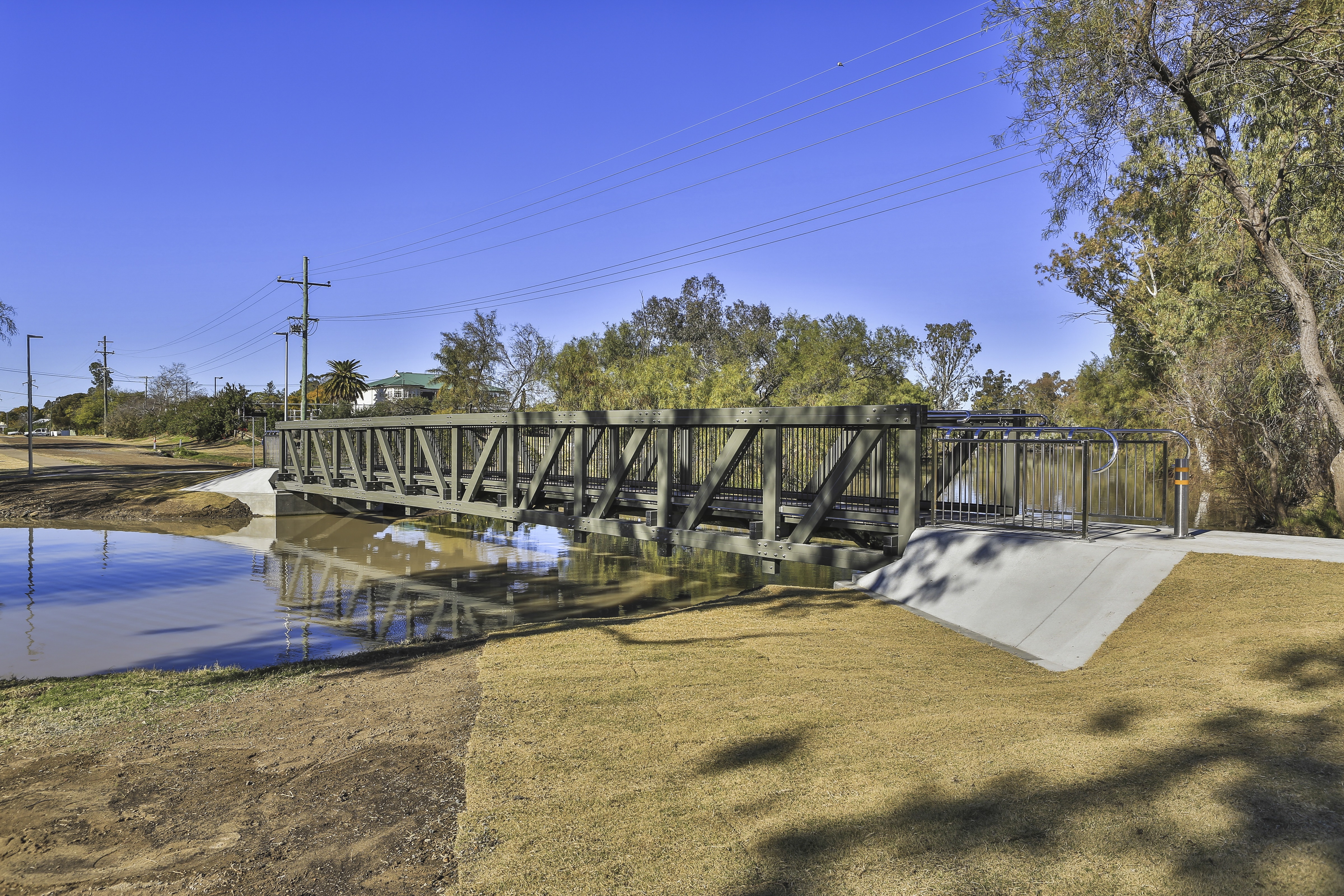 This footbridge in Dalby which crosses the Myall Creek was Wagners CFT's first long span footbridge spanning 24 metres from one end to the other. Situated close to Dalby State School the footbridge is used daily by its school students to get to and from school.