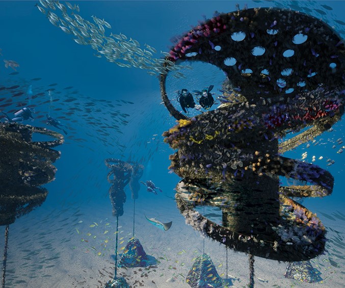 The Wonder Reef project is a fusion of science, art and engineering that empowers nature while bolstering tourism and the local economy. Artist Daniel Templeman designed nine buoyant ‘sculptural reef flutes’ individually tethered to the seafloor by 62-tonne reinforced Earth Friendly Concrete® and steel pyramids. The sculptural reef flutes will stand 16 to 20 metres above the ocean floor with foundations that are designed to support an abundance of fish and serve as sustainable habitats for a diverse range of marine flora and fauna.