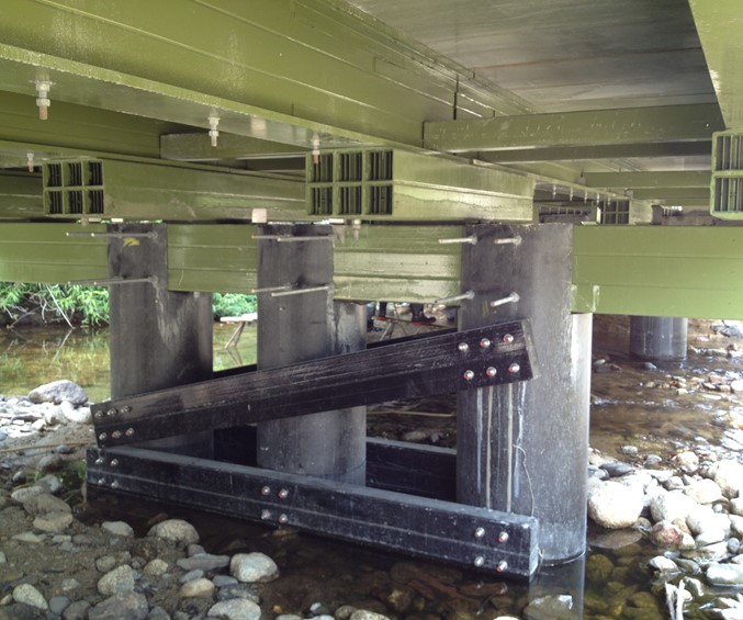 The new Wagners CFT Baio Bridge was built using the existing timber piles. The old timber bridge was demolished until all that was left was the timber piles, the timber piles were then cut down until they were considered as good timber, then sleeved with a composite round pile which was back filled with concrete to unify the 2 elements. From the Wagners CFT used its conventional bridge members to build a new composite road bridge.