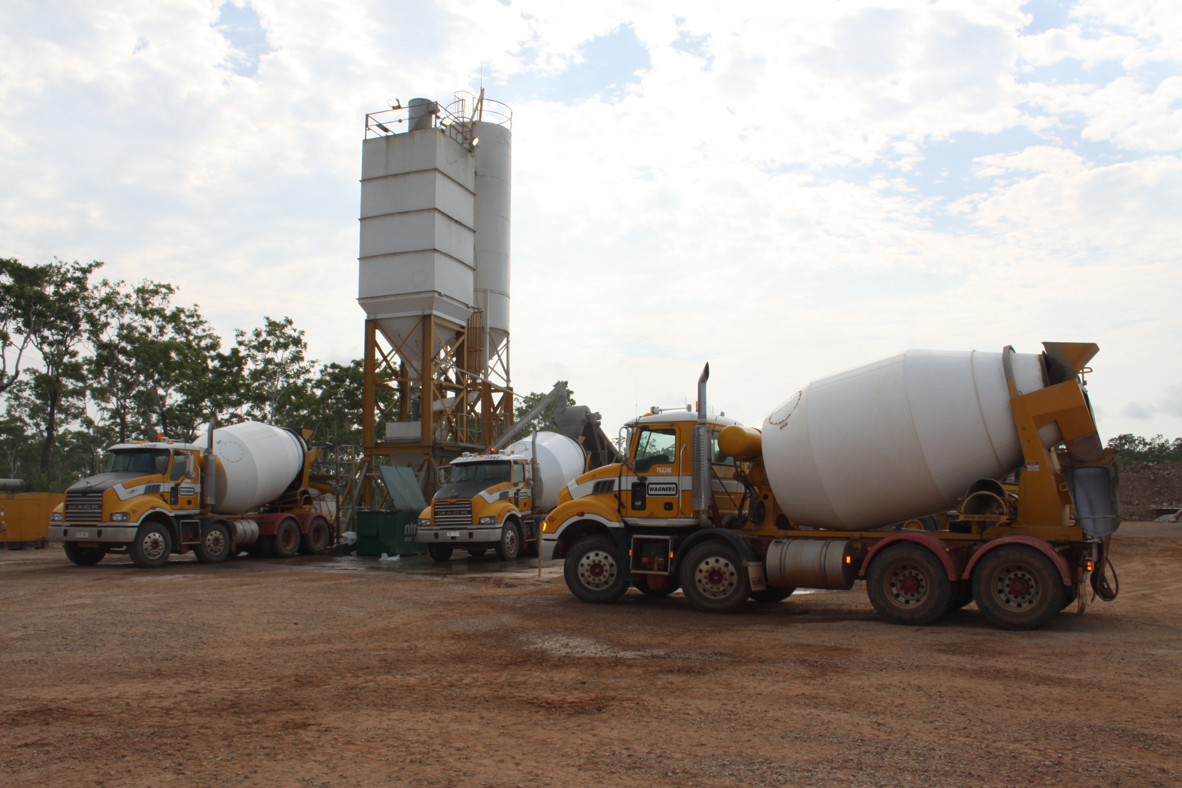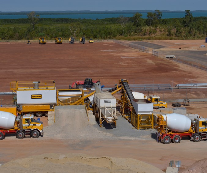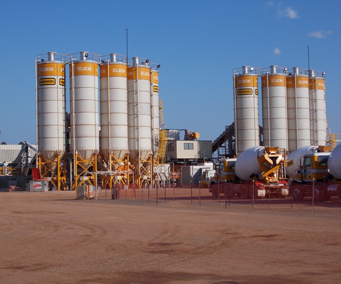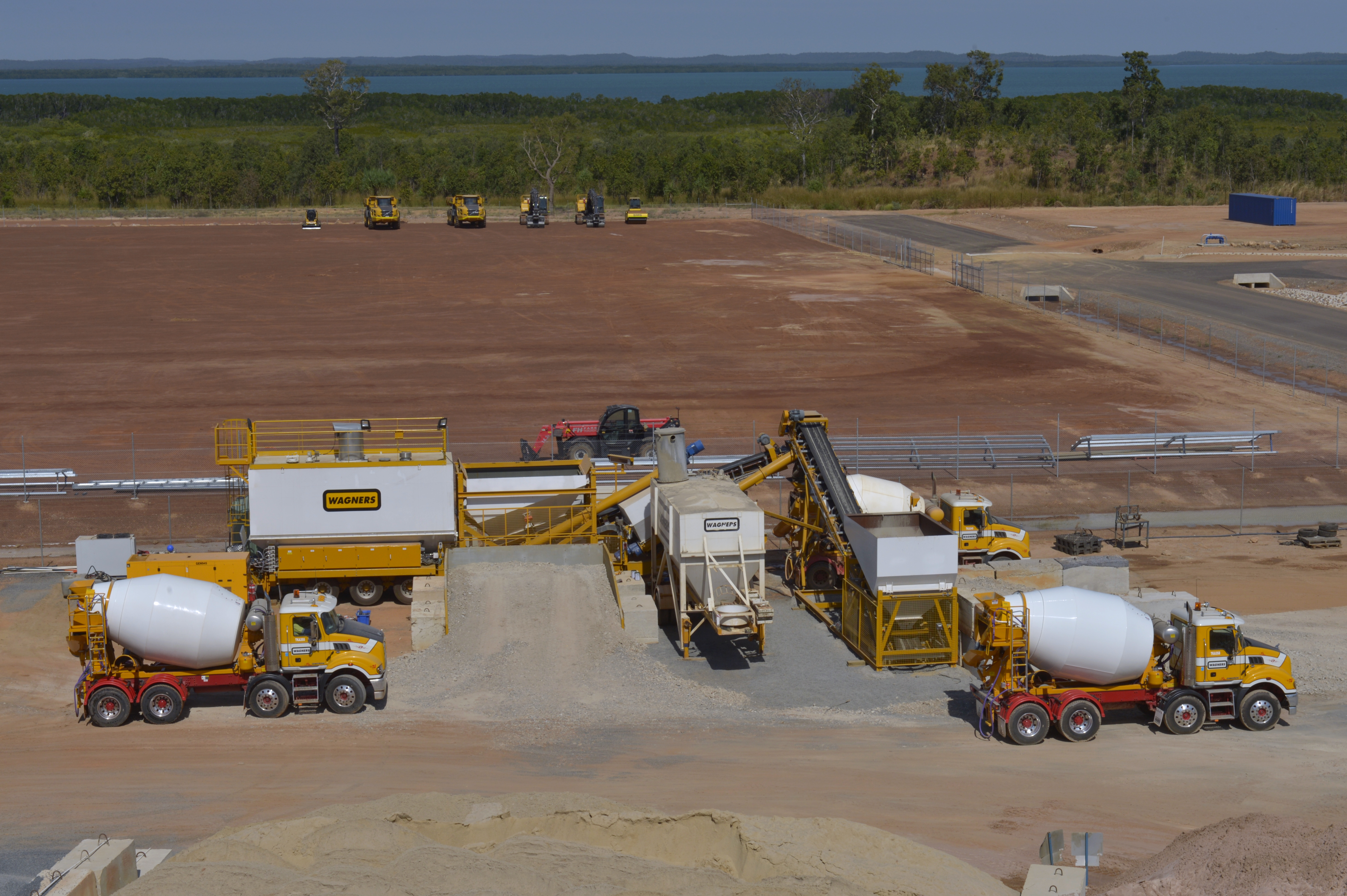 During peak production 2 X 120m3/hr wet mix plants and 1 X 50m³ dry mix concrete plants with 1600 tonnes of cement storage were deployed to site along with a fleet of 24 concrete delivery agitators 4 or which were sourced from a local indigenous business. As well as concrete production equipment Wagners also incorporated into the concrete production operations ice manufacturing equipment with 200 tonne per day production to produce ice for incorporation into concrete for temperature control.