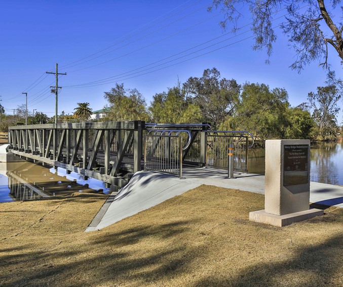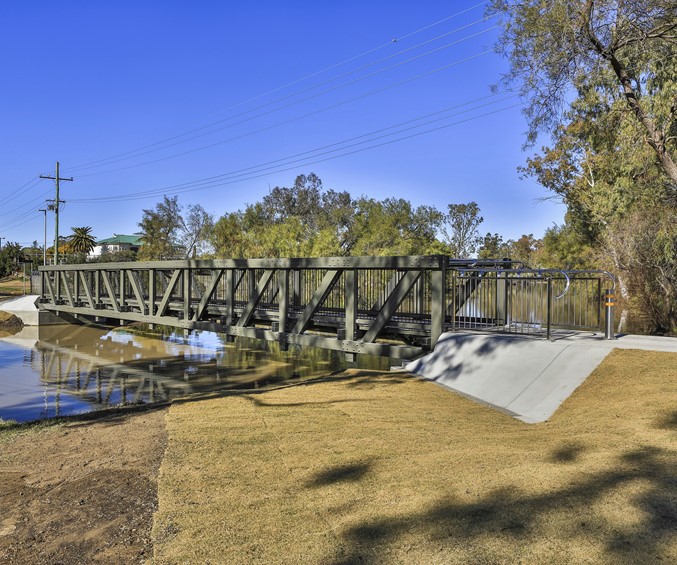 This footbridge in Dalby which crosses the Myall Creek was Wagners CFT's first long span footbridge spanning 24 metres from one end to the other. Situated close to Dalby State School the footbridge is used daily by its school students to get to and from school.