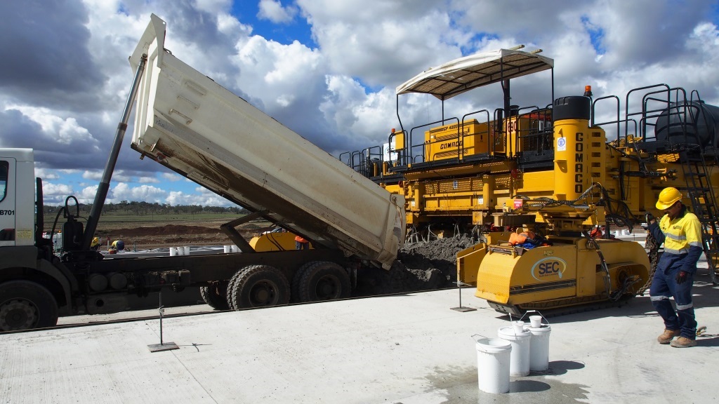 EFC was produced in a twin mobile wet mix batch plant established on the BWWA project site. A maximum supply capacity of 120 m3/hr was required to provide a continuous feed of concrete to the slip form paving machine which was successfully achieved using several tipper trucks for delivery.