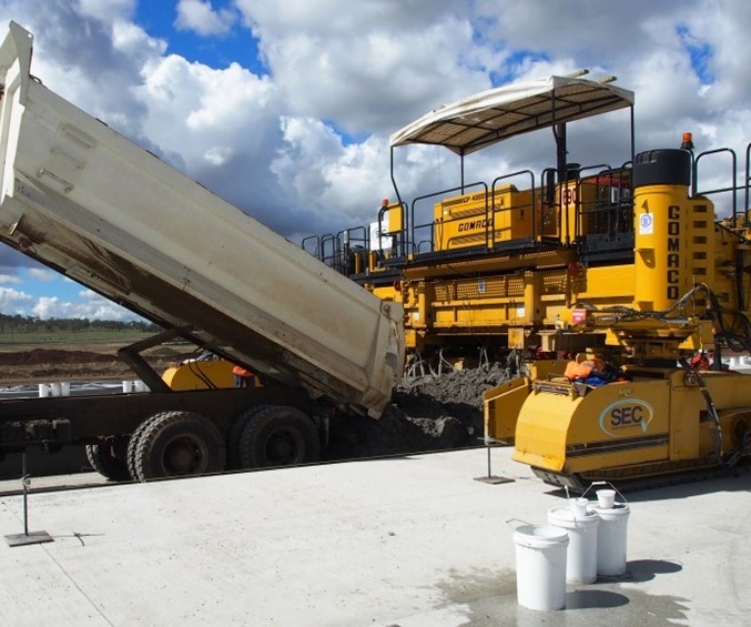 EFC was produced in a twin mobile wet mix batch plant established on the BWWA project site. A maximum supply capacity of 120 m3/hr was required to provide a continuous feed of concrete to the slip form paving machine which was successfully achieved using several tipper trucks for delivery.