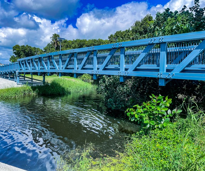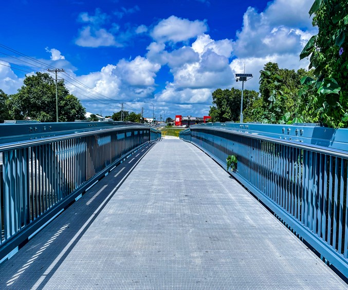 Willetts Road Cycleway Crossing in Mackay is made from our Composite Fibre Technologies sections. It is a 24.5m single span bridge including 34m of boardwalk, which is resistant to corrosion, lightweight yet strong, and requires minimal maintenance. For this particular project our materials were also used as bridge footings, instead of concrete.