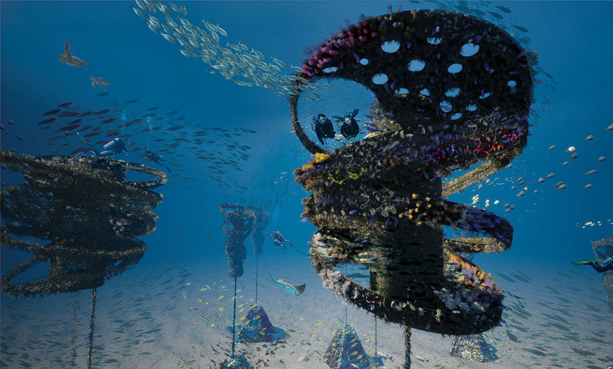 The Wonder Reef project is a fusion of science, art and engineering that empowers nature while bolstering tourism and the local economy. Artist Daniel Templeman designed nine buoyant ‘sculptural reef flutes’ individually tethered to the seafloor by 62-tonne reinforced Earth Friendly Concrete® and steel pyramids. The sculptural reef flutes will stand 16 to 20 metres above the ocean floor with foundations that are designed to support an abundance of fish and serve as sustainable habitats for a diverse range of marine flora and fauna.