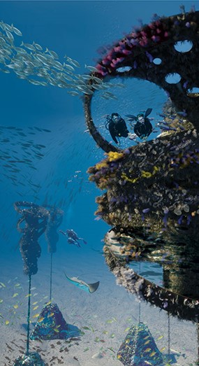 The Wonder Reef project is a fusion of science, art and engineering that empowers nature while bolstering tourism and the local economy. Artist Daniel Templeman designed nine buoyant ‘sculptural reef flutes’ individually tethered to the seafloor by 62-tonne reinforced Earth Friendly Concrete® and steel pyramids. The sculptural reef flutes will stand 16 to 20 metres above the ocean floor with foundations that are designed to support an abundance of fish and serve as sustainable habitats for a diverse range of marine flora and fauna.